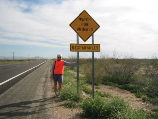 | a bit further along, roma took my picture at this roadside sign. we couldn't figure out what kind of animals we were to watch for (for 60 miles!!), but we didn't see any of any kind. we did, however, notice lots of pretty little flowers along the road...tiny purple ones, small white ones, yellow ones, & some vivid orange ones that reminded me of buttercups (maybe they are buttercups). |