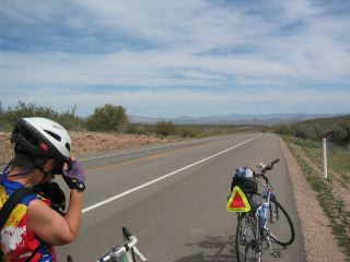 | as the sun rose above the horizon, many of us started east on US60. there wasn't a lot of traffic for quite a while. the road just went on & on in a straight line at a slight incline, which meant constant pedalling with no coasting. we had some headwinds for a while, too; gloria said she'd never had headwinds on this stretch before. but the landscape was beautiful & the temps very comfy....cool at first, & never rising to the baking temps we've experienced the last couple of days. |
