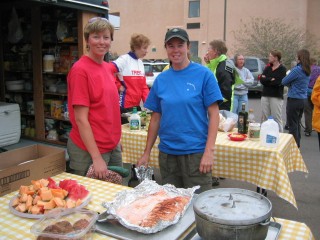 | supper tonight was scrumptious. here are michelle & catherine opening the foil packages of salmon they had just grilled. with that we had rice steamed with sun-dried tomatoes, steamed fresh broccoli, green salad with all the trimmings, delicious fresh cantaloupe & watermelon, & bread...with cookies for dessert. you can see the riders hovering near the tables there in the motel parking lot anxious for the dinner bell to ring. |