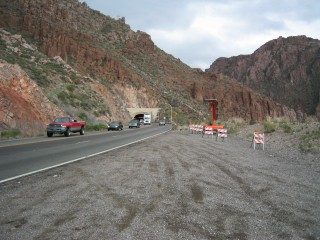 | within about 3-4 miles we came upon the much-anticipated queen creek tunnel. you can see the tunnel's entrance in this photo....& the beautiful landscape all around us. as you can also see, we had to share the tunnel with lots of traffic. |