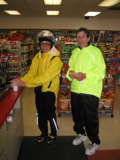 | but what was she doing in a car wash....in the rain....especially with a convenience store 1/2 block away? i rode my bike thru the rivers of water past the gas pumps to the car wash, & there she was, fully clad in every piece of apparel she'd packed on her bike this morning, including the shower cap over the helmet under the rain hood. she had evidently changed her clothes in the car wash. & she had not seen the convenience store 'til she looked over & saw elaine & me. elaine was shaking from the cold, & roma, who has renaud's syndrome, had lost sensation in all her fingers & they'd turned white. once inside the store, we each had a large cup of coffee or hot cocoa. the clerk told us it was free. |