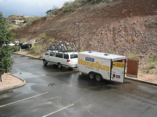 | catherine got to the motel about 1/2 an hour after we arrived with 12 bikes on top of the van (see photo) & the riders inside. |