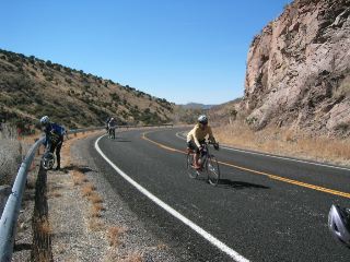 | how gorgeous it was today!! it was 36 degrees in silver city this morning, so we dressed warmly. most everyone left by 7 a.m. in the first few miles we went up & down some good-sized rollers. at about 10 mi we came to a vista into a huge, canyon-size pit that's a silver mine. the van was parked there, & it was at this spot that vicky shared with us the wonderful 'trail mix cookies' that her friend jean had sent. |