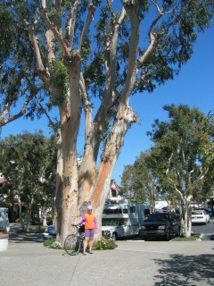 | we pedaled southward from oceanside---traveling thru neighborhoods when we could in order to avoid the highly trafficked hwy 101 that we couldn't avoid the rest of the time. at carlsbad we made a rest stop at a set of condos. look at this beautiful huge eucalyptus tree standing nearby. |