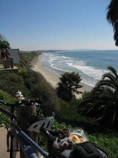 | a little further down the street we turned toward the shore & stopped at a lookout point called swami's to eat the grapes & apple slices we'd brot along for a snack. the view from here down the beach was beautiful, as you can see. you can also see the grapes & apples on my makeshift snack table/bike-trunk top. |