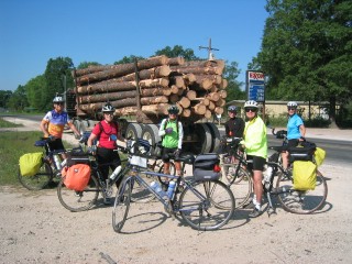 | this photo clarifies why log trucks are so common on roads in this area. (notice the panniers the iowa citians carry on their bikes. sari, pannierless, is riding behind them.) |