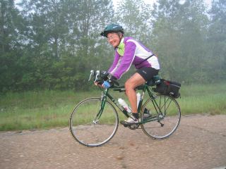 | while riding in the subaru, we played a tape of patty's zydeco music, & would roll down the window so riders we passed would be buoyed by the music. here's a photo of caroline as we passed her. |