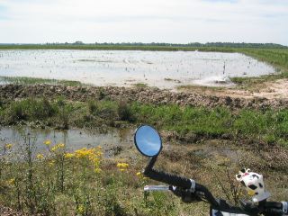 | back on our bikes, we couldn't help but think how just a week or so ago we were riding in arid, almost-mountainous country. now we're surrounded by water & flat lands. in this photo is a rice field, one of many we passed today. |