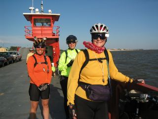 | once the few cars lined up for the ferry drove onto it, they let us bikers walk our bikes on. it was a beautiful day & a lovely boat trip across mobile bay....very smooth, except for a few dips when we hit higher waves; one wave even came splashing over the front of the ferry, dampening a biker or 2 standing in that spot. |