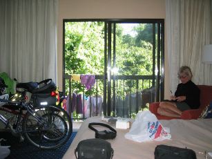 | in this photo you can see our biking duds on the line out on the balcony of our room....& the bikes inside the room. we women bikers can trash even a place as nice as the marriott in short order. but you'll also notice the trees out there; our locale along the back of the marriott has made for a very restful stay; we've enjoyed listening to all the birds singing in those trees, too. unfortunately, some in our group were located near the rooms of a wedding party, so were kept awake much of last night. |