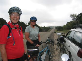 | we had 2 very steep climbs today....& 2 very steep descents, along with plenty of smaller (but steep) climbs & descents thrown in between. here's a photo of sari near the top of the first climb...looking back toward this beautiful texas hill country that we were cycling through. |