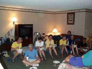 early their rooms aren't ready.) our room is HUGE. it includes a large entertainment center, little fridge & microwave, hide-a-bed couch, recliner,desk & chair, & 2 queen beds......& even after all that, there's a ton of space open in the middle of the room. in fact, since it began raining outside just as we were about to start eating supper tonight, everyone came to our room to eat. |