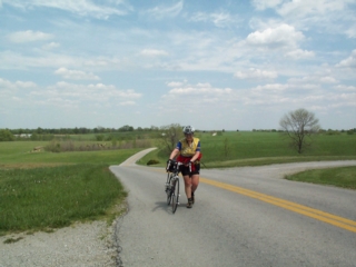| rollers....that's the word for today. many of them were some pretty high rollers at that! after getting out of the early-morning traffic of harrodsburg, we emerged into beautiful rolling countryside....as picturesque as you can imagine. at the end of the day many riders were pretty tired from the endless climbing, but if you got enuf of a run down one hill, you could usually roll up the up side of the next hill most of the way to the top. of course some situations didn't allow you much of a downhill 'launch' & that just meant more muscle power to get to the top of the next crest. & there was always a 'next crest' today! |