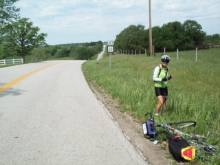 | a mile out of walnut grove our route turned left/south. that was a mistake. the strong winds that had been pushing us along or at least posing a minor bother from the side were right in our faces for 6.5 miles to ash grove. but just as well; the whole day's ride would have been way too easy without that stretch. |