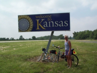| FINALLY we approached kansas. just at the state line we came across a little gas station/convenience store. we thot it was a mirage. we fell off our bike seats & hobbled inside to use the restroom & get something to drink. i polished off a pint of chocolate milk in no time......whole chocolate milk, fat calories & all. |