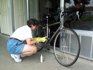judith, for instance, as you can see in the photo, donned her elbow-high rubber gloves & gave her bike a thorough cleaning. |