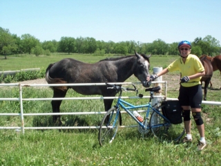 | on down the road the subaru was stopped near a horse pasture. we stopped to fill water bottles & inhale a few chocolates (hershey's nuggets with almonds, reese's peanut butter cups, hershey's kisses...all kept in a small cooler so they won't melt). 3 of the horses in the nearby pasture took a real interest in us. in fact, one of them took a particular interest in patty fainer's bicycle, which she had leant against their fence. first he started nibbling on the handlebars, then the bike seat post, then the bike seat itself. |