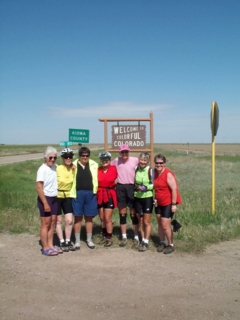 here you see the official colorado welcome sign. from left are me, lee, sarah, gerrie, patty fainer, sari, & jackie. |