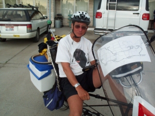 | in this photo you'll see mike on his easy racer recumbent bike; i hope you can also see the map of his route that he's taped to his wind screen. | ![]() |