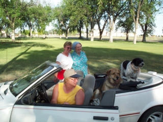 pictured here are linda, one of our sag drivers (& sometimes a biker) for this trip segment. she's standing with her mom. her sister dona is in the car; she lives in pueblo with her 2 canine friends, who ride in the back of the convertible. |
