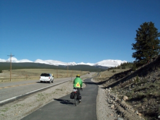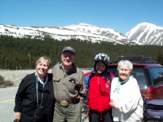 | once we got past the steepest & crookedest part of the descent we ended up on a gently sloping roadway into breckenridge. what a built-up & commercial area it is...but of course the scenery is breathtakingly beautiful. we made our way to the tyra condos where we're staying. each condo has 4 bedrooms; there are 7-9 of us in each. they have full kitchens, fireplaces, decks, 3 baths, & even after we park all our bikes inside, they're quite roomy. |