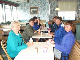 | at 40 miles we came upon the ONLY town on today's 65-mi route.....hartville. the bikers had been by earlier & stopped at a local cafe, but were gone by the time we hit town. sari & i decided to visit the conoco convenience store instead...for the restrooms & some ice cream. the woman hand-dipped our ice cream & boy did she pile it on. it was hard to balance it on top of the cone part. sari & i couldn't even put down the cones to pay for them, so had to pay after we were done. those things were huge. gave us the energy to go out again & face the weather. |