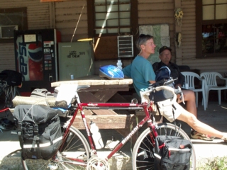 | while 5 of us riders were there, a self-contained biker stopped by also. here's a picture of him & his bike; he's sitting on the porch chatting with the "cold pop" proprietor. he was riding from eugene, oregon, & plans to stop at jackson hole & fly home (richmond, VA) from there. he told us that earlier this week he had to push his bike for 2 miles in the snow when going over mckenzie pass (on our route for next week---yikes). | ![]() |