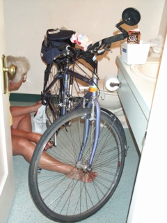 | you'll see it here on ice in our bathroom. that's me doing the final cleaning & lube of my bike for this trip....maybe forever. i'm not one to clean & lube my bike; after wednesday i'll be glad to start leaving that job to my iowa city bike shop again. since our room is on the 3rd floor of the hotel & it's a tight squeeze getting the bike into the tiny elevator, i decided that the bathroom was the easiest place for bike maintenance today. | ![]() |