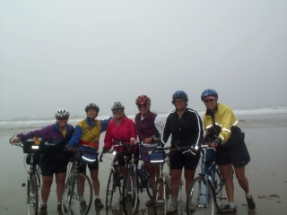| once we'd dipped & congratulated each other & taken lots of pictures, we pushed our sand-laden bikes back up the beach & thru the driftwood to the motel parking lot. the motel let us use a high-powered spray to clean off the bikes. most of the bikes were then whisked away to a local bike shop for boxing & sending home UPS. |