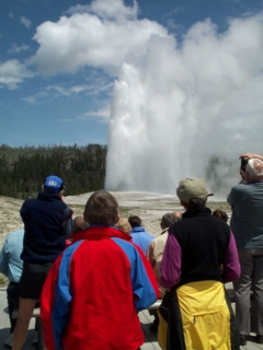 | what an impressive sight old faithful is. doug told us that it spouted about 175 feet into the air today; it varies. even on a day so early in the tourist season, there was an arc of hundreds & hundreds of people viewing this eruption of old faithful. |