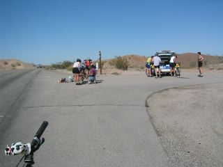 | sue did a great job today with the subaru.....providing us water & other assistance at crucial points along the way. as she said, there was no way to drink enough water today. no matter how much you drank, the winds & heat took their toll in a hurry. at about 25 mi out of blythe, there was a group of us stopped at a wider place in the road (there weren't many of those, so we tended to take advantage of them for a short rest stop). it wasn't long before sue pulled up in the subaru with her welcome load of water. as several of us were about to leave, we heard a sssssssssssssss & looked around. there was karen's back bike tire deflating before our very eyes. as discouraging as that was, how lucky that sue was there with everything needed to fix the flat in short order. |