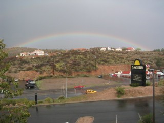 | but then a little later toward the east we saw this rainbow....ending at the days inn. the folks here are very nice to us & the accommodations are roomy & comfy. the hot tub was crowded to overflowing with bikers by late afternoon. you can also see the dairy queen sign right across the street; i've been looking for a dairy queen every day of this trip with no luck, but today i was too tired & cold to stop there. |