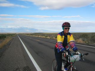 | the scenery today was breathtaking. early we rode along hwy 191 on some rollers that gave us a little practice at the climbs that were to come. here's marilyn boger at the end of a long gentle climb. we went up & over what seemed like a pass, then did a long downhill thru a construction zone, which meant sharing the road with lots of heavy trucks. |