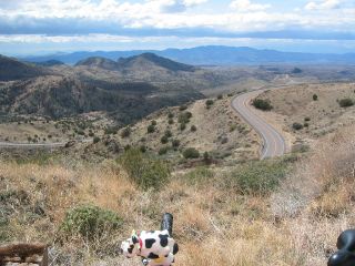 | here's a photo downward & backward from near the pass. (that little cow horn that you see in many photos is on my bike handlebars; my maiden name is holsteen (spelled slightly different than the cow's name). i like to get a biker--or at least a bike part--in most photos.) |