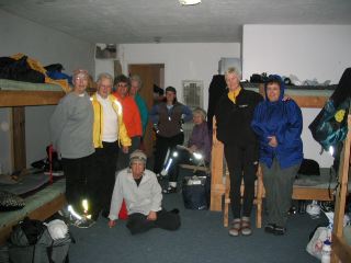 | here's a photo taken a little later in the bunkroom where i slept. in front is carolyn, then from left are sandy (who's fighting a nasty bronchial/sinus malady), mary from boston, becky, marilyn boger, kathy grubb, bev, anne, & jane. (notice how well the reflective strips on our bikewear work!) |