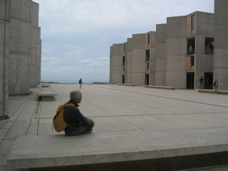 | the atmosphere in la jolla farms was a bit stifling, so we quickly pedaled off on northward to the salk institute. here peter rests on a bench in the building's courtyard. louis kahn was the architect of this famous structure. | ![]() |