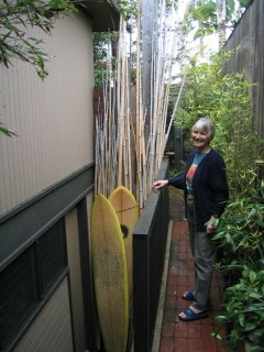 | here's sari making her way back to her studio. the gantzels' home is unique in california; it has a basement. notice the surfboards & long lengths of bamboo leaning down near the basement door. all the gantzels are very athletic. | ![]() |