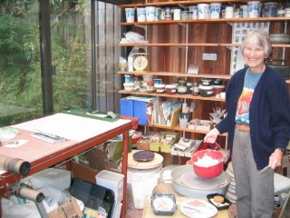 here's sari in her studio; it's a room made of glass & screens in a back corner of the rear patio to the back of the house. it's a real artist's haven. |