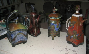 | these are 4 of sari's pots that will soon be in a local pottery show. she has won a prize with one of them. she sells many of her pots at the potters' guild's shop located in the spanish village in balbao park, where we went sunday evening. | ![]() |