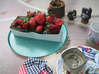 once back home we put together a little lunch from some delicious leftovers, then for dessert enjoyed 2 strawberries apiece from this basket of berries sari had bought from a vendor selling his fresh, locally-grown berries outside trader joe's. you're thinking big berries don't taste good. not so with these. the flavor was magnifico! we had more of them this evening for dessert. note the purple-hued mug on the table; it says "it's my body and i'll eat pie if i want to." |