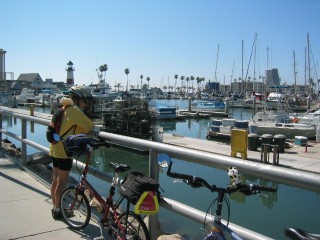 | after a breakfast of peter's oatmeal & lots of toppings, we put ourselves & our bikes together & piled everything into the gantzel pickup. peter drove us north about 30 mi to oceanside. we had hoped to go further to--the north edge of camp pendleton. sari & peter have ridden thru the marine base before & they say the views from the base's oceanside roads are beautiful. but the marines at the south gate said that policy changed last year, as we expected, so we couldn't ride thru the base. so peter dropped us off at the harbor in oceanside. |