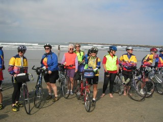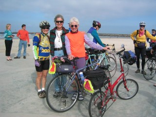 | it was a beautiful day for dipping. elisabeth rode with us & peter & our bikes to san diego's dog beach; it was wonderful to have her there for the sendoff. when she arrived at sari's, she gave me a bouquet of purple flowers & a fresh-picked orange from her garden. she'd put the flowers in a little vial of water, so they adorned my bike bag all of today's ride. i refilled the water when i got to our motel this evening, & i think i'll get at least another day out of the lovely bouquet. i thot the winds might whip them as i rode, but they're hardy. |