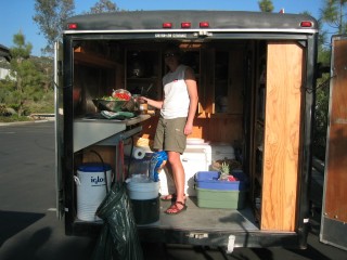 | just before dinner i caught michelle working away in the galley; can you see that beautiful salad she was concocting....& the beautiful cherry tomatoes? unfortunately the shadows obscure michelle's head in this photo, but at least you can see the clever galley that's been custom-made into the back of the luggage trailer. |