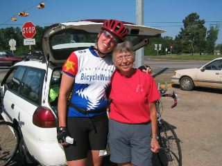 | at this point we had another 25 mi to ride to our motel in de ridder. it was warm, so we stopped at a convenience store for cold drinks (&, in my case, an ice cream bar). frances came by in the subaru to check on us. we filled our water & gatorade bottles & told her she didn't need to worry about coming back out on the route again....unless we called. |