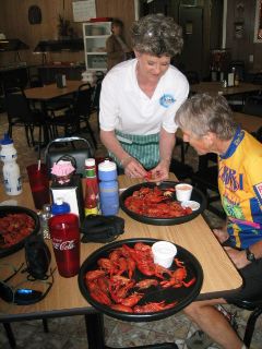 | a little later, sari & i stopped in the driveway of an conocoi station in mamou to decide if we wanted to go inside for anything. while pausing there, a local called out to us, "that's a great place to eat." he was referring to the little restaurant next door to the conoco station that had a sign in one of its windows: "crayfish, 99 cents a pound." in a little while, loralee rode up. we 3 decided to go inside, & we each ordered a pound of crayfish. |