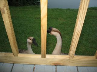 | it's so quiet here, & the weather was beautiful all day...warmish this afternoon. all we could hear upon awaking after 6 a.m. was the serene sound of the little fountain out in the middle of the pond off our front porch....well, & the geese. roma got up & went out on the porch to read. i followed shortly thereafter with my camera to find out what the 2 large resident geese were upset about this time. they stroll--& patrol--the plantation making sure everything is to their liking. i got the feeling that us sitting on our front porch early in the morning wasn't. & we found out yesterday that the gander can become very aggressive if any of us makes a misstep in his direction. they're very particular about the activities of the ducks, too. |