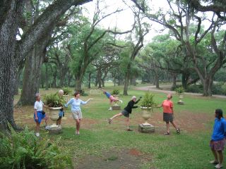 | a bit later, sari, roma, & i--who share the b&b cottage named "chase's cottage"--fixed breakfast with the makings left for us in our cottage (cereal, juice, milk, bananas, coffee (for roma)). at 9, we went over to the main house for a very informative & interesting tour led by anne butler, the plantation's owner. before the tour started, several of our group were doing imitations of various classic statues out amongst the urns on the front lawn. |