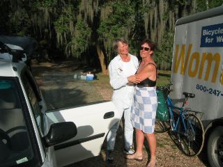 | here's a photo of kathy being greeted by laura. kathy has rejoined our tour & will ride with us the rest of the way to st. augustine. we're all so happy to have her back! |
