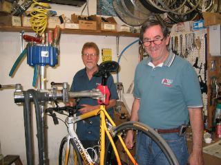 | after the mechanic checked over my bike, finding nothing amiss, i took this photo of john the mechanic (left) & tec, owner of tec's bicycle shop. john has worked at the shop for 22 years, & tec for 25. tec gave sari & me each a 25th-anniversary water bottle. |