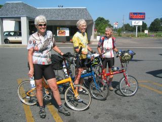 | while there i took this photo of the 3 bike fridays on this trip. from left are gloria smith (she's the founder & owner of womantours; she joined us in tallahassee for the rest of the tour) with her orange "pocket rocket," bev with her blue "crusoe," & sari with her "new world tourist." bev is wearing her bike friday cycling jersey, with bike friday's motto on it: "performance that packs." learn more about bike friday. |